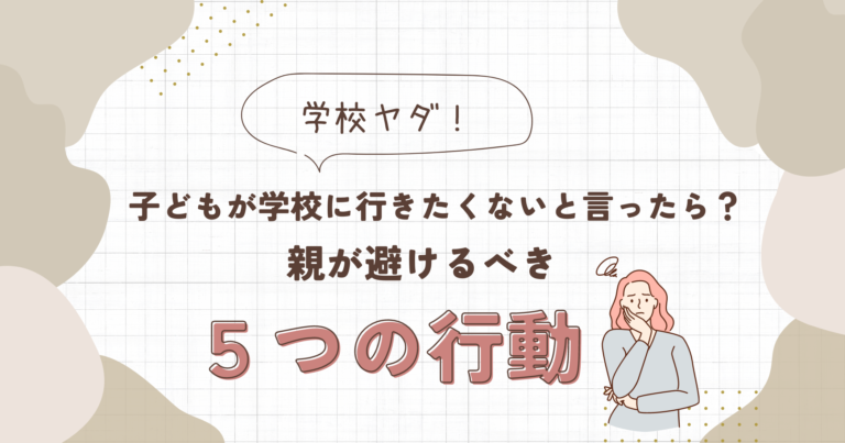 目次子どもが「学校に行きたくない」と言ったら?親が避けるべき5つの行動1. 無理やり学校に行かせる2. 子どもの感情を軽視する3. 比較する4. 怒りや失望を表す5. 無関心を装うまとめ 子どもが「学校に行きたくない」と … 続きを読む 子どもが「学校に行きたくない」と言ったら?親が避けるべき5つの行動