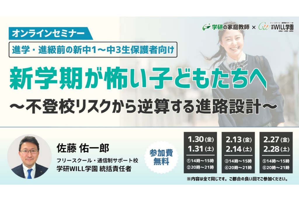 新しい環境への期待とともに、不安も募るこの時期。株式会社学研ホールディングスのグループ会社、株式会社学研エル・スタッフィングは、不登校や発達障害、グレーゾーンの傾向があるお子様を持つ保護者様を対象とした無料オンラインセミナー「新学期が怖い子どもたちへ ~不登校リスクから逆算する進路設計~」を開催いたします。