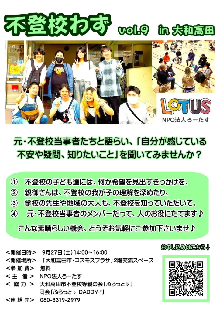 2025年9月27日、不登校の子どもと保護者を支援するNPO法人ろーたすが、イベント「不登校わずVOL.9」を奈良県大和高田市で初開催します。不登校経験者である卒業生たちが、自身の経験を語り、同じ悩みを持つ保護者や子どもたちに希望を届けるイベントです。
