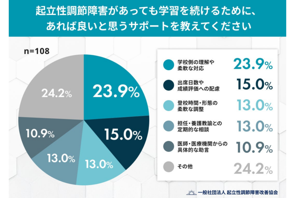 最も多かったのは「学校側の理解や柔軟な対応(23.9%)」。数値や皆勤に縛られない、教育現場の温かな理解が精神的なセーフティネットとして求められています。