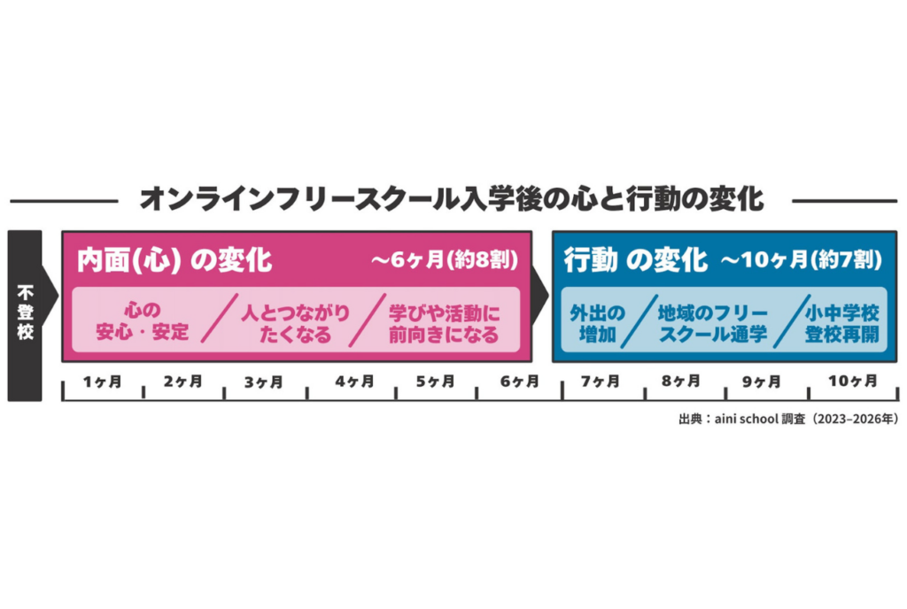 株式会社ガイアックスが運営するオンライン・オルタナティブスクール「aini school(アイニースクール)小・中等部」が、215名のデータを分析。そこに見えてきたのは、オンラインという安全圏で「心のエネルギー」を蓄えた子どもたちが、自らの意志でリアルな社会へと踏み出していく、回復の軌跡でした。