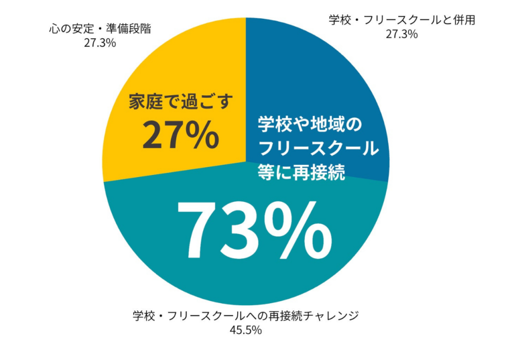 入学直後に行動の変化が見られた家庭は36%でしたが、約10ヶ月が経過する頃には68%の家庭で具体的な行動の変化(登校再開や外出増など)が確認されました。心の土台が整うのを待つことが、結果として社会への再接続を早めているのです。